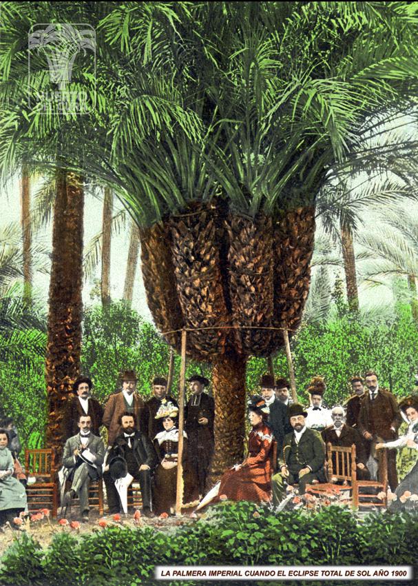 🌴La casualidad quiso que el eclipse total de sol de mayo de 1900 estableciera Elche como el lugar de mejor observación. Llegaron a la ciudad multitud de delegaciones científicas de todo el mundo, y entre sus atractivos visitaron el Huerto del Cura. Entre los lugares más inmortalizados por las potentes cámaras fotográficas que portaban estaba la Palmera Imperial, imagen que desde entonces, comenzó a ser difundida en prensa y revistas internacionales.